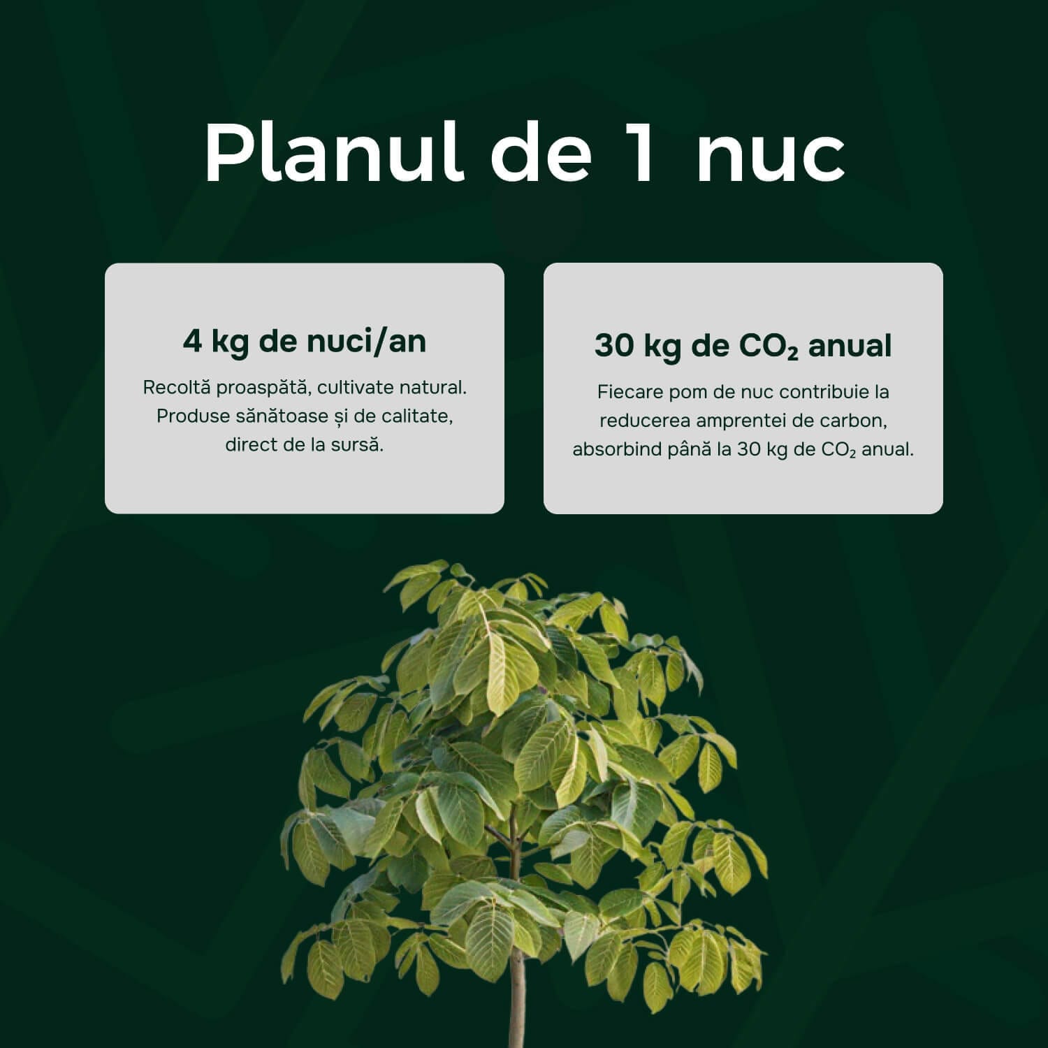 • Fiecare pom de nuc contribuie la reducerea amprentei de carbon, absorbind până la 30 kg de CO₂ anual.